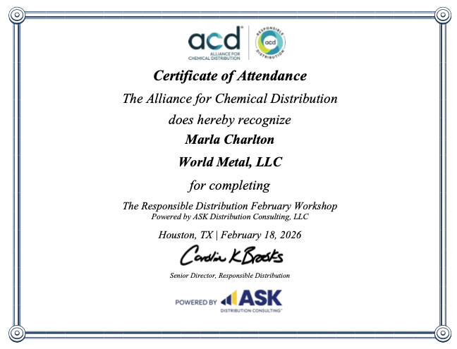 World Metal, LLC remains committed to the Alliance for Chemical Distribution Responsible Distribution program. Marla Charlton, RD Coordinator for World Metal, LLC, […]